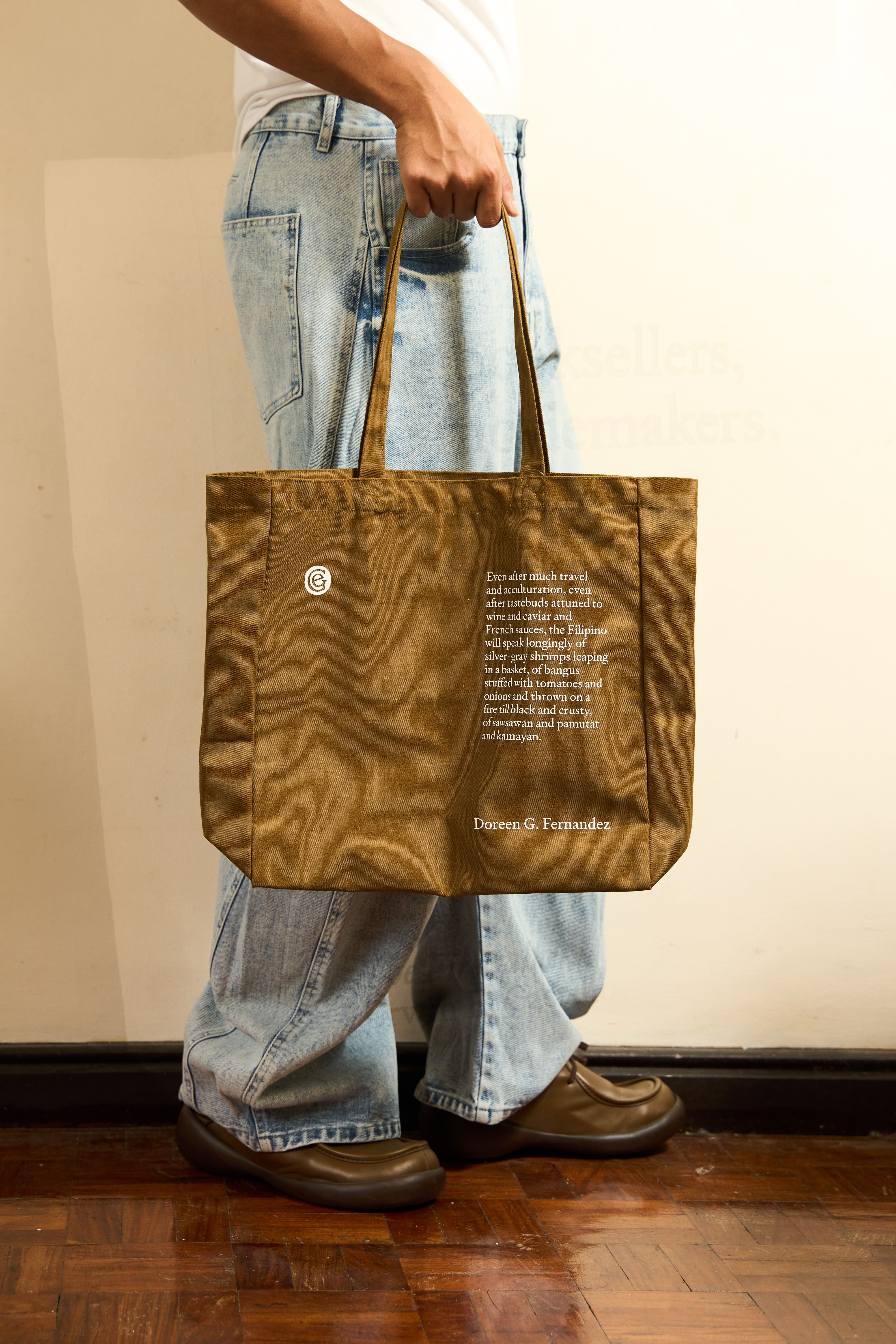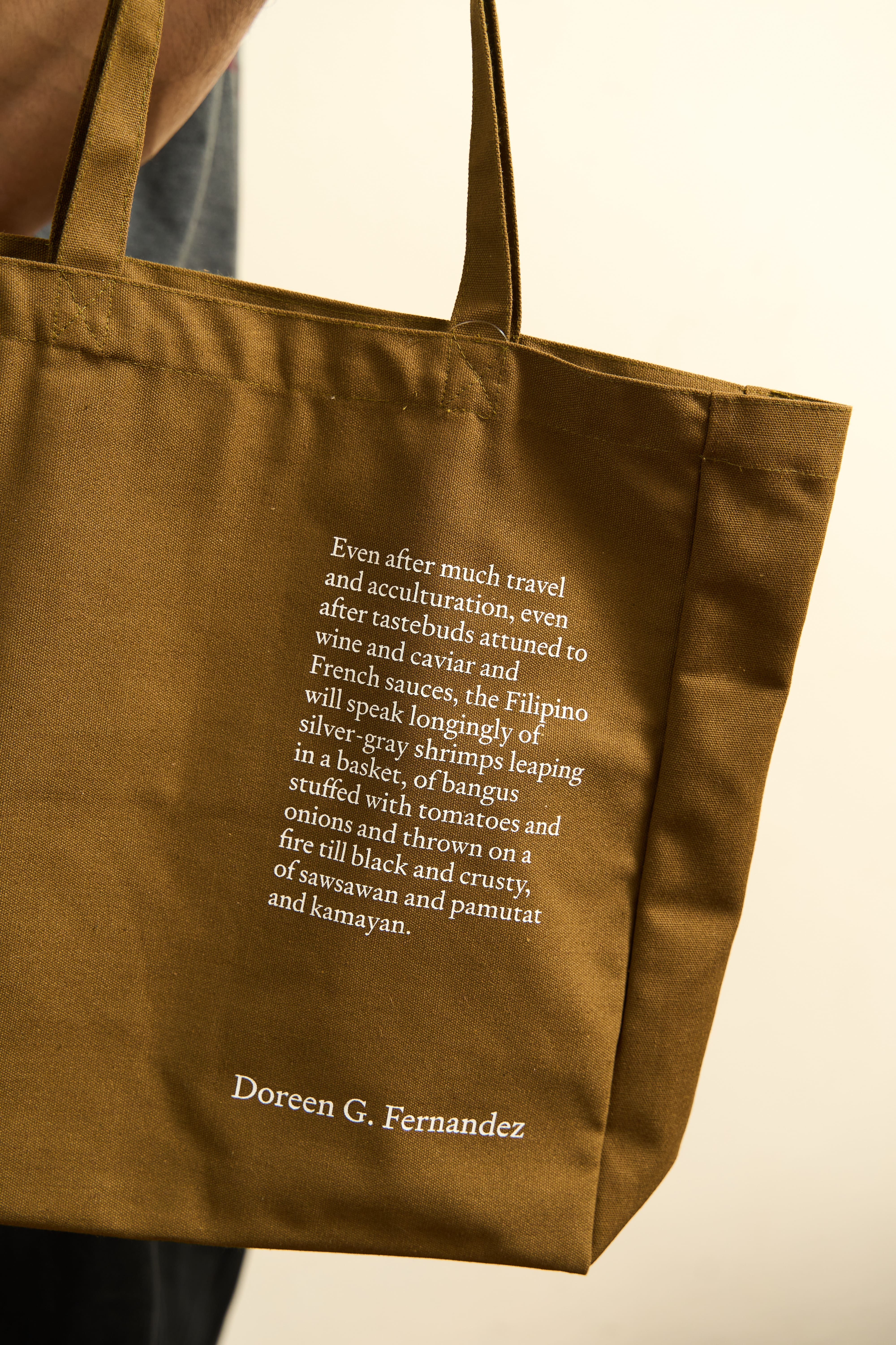 Sturdy, roomy, everyday tote bag with zippered inner pocket. Comes with a quote by Doreen G. Fernandez: